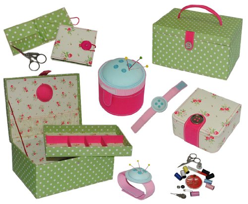 passend zu diesem Motiv sind noch größere Nähkörbe, Nadelkissen, Maßbänder, Reiseset, Knopfkisten, Nähetuis´s oder auch ein Komplett Set erhältlich