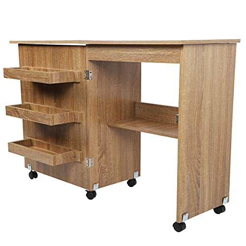 Merkmale: Klappbarer Nähtisch mit Aufbewahrungsschrank und Rollen, ein multifunktionaler Holznähtisch mit kleinem Platz, der einfach zu montieren ist, mit drei Regalen und einer Trennwand, feststellbare Rollen