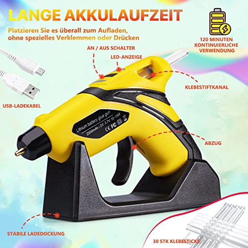 🏆PATENTIERTES KABELLOSES DESIGN: Die kabellose Klebepistole mit 2200 mAh Premium Lithium-Ionen-Akku kann mit allen USB-Geräten 5V/2A wie Laptop, Powerbank, Adapter usw. aufgeladen werden. Es dauert nur 2 Stunden, um vollständig aufzuladen und kann bis zu 100 Minuten arbeiten, mehr Komfort und tragbarer Betrieb, verabschieden Sie sich von lästigen Kabeln!