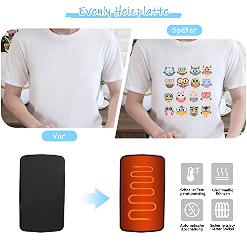 🎁Schnelle und gleichmäßige Wärmeübertragung🎁: Die Heizplatte aus dem druckgegossenen Aluminiumpaket Trockenheizrohr, 500 W Leistung und die Größe der Heizplatte beträgt 7” x 4” (18cm x 10cm). Das macht die HTV-Vinyl-Projekte Kann schnell und gleichmäßig erhitzte Platte überträgt trockene und gleichmäßige Hitze an jeden Ort und verschiedene Tücher.
